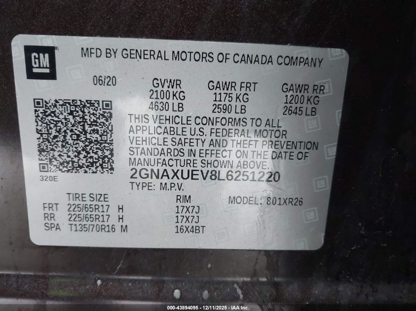 2020 CHEVROLET EQUINOX - 2GNAXUEV8L6251220, колір - Коричневий, 1.5, Бензин, Повний привід із США