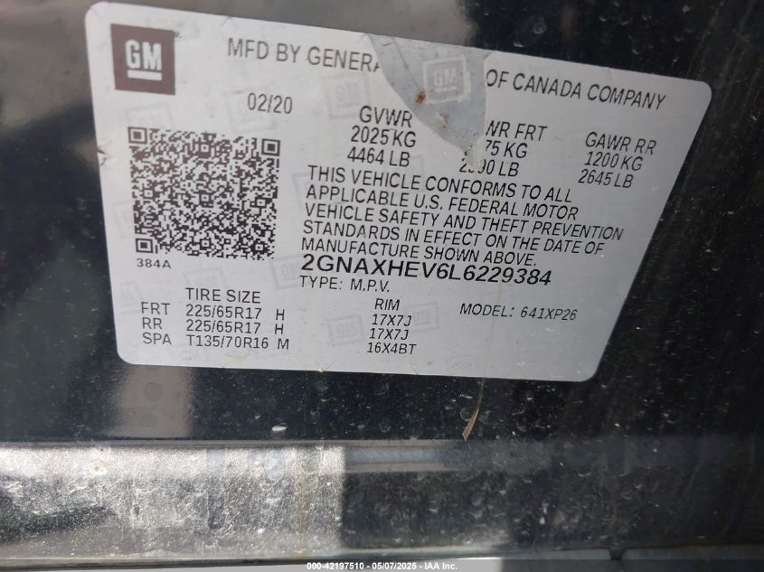 2020 CHEVROLET EQUINOX - 2GNAXHEV6L6229384, колір - Чорний, 1.5, Бензин, Передній привід із США