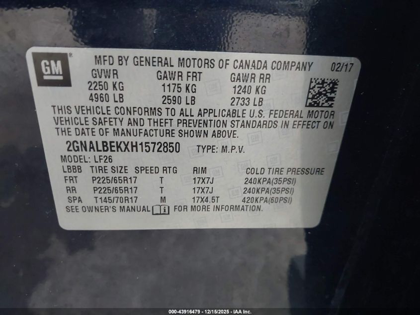 2017 CHEVROLET EQUINOX - 2GNALBEKXH1572850, колір - Синій, 2.4, Бензин, Передній привід із США