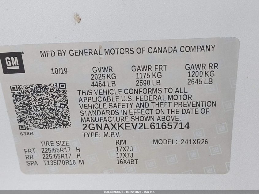 Колір СрібнийЦиліндри 4Привід Передній привідVIN 2GNAXKEV2L6165714Стан СтаціонарноУшкодження Біо/Хімічні