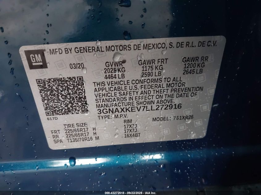 2020 CHEVROLET EQUINOX - 3GNAXKEV7LL272916, колір - Синій, 1.5, Бензин, Передній привід із США