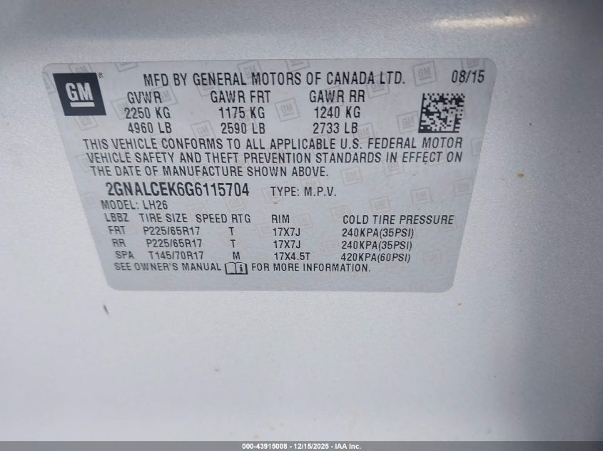 Колір СрібнийЦиліндри 4Привід Передній привідVIN 2GNALCEK6G6115704Стан НевідомоУшкодження Звичайний знос