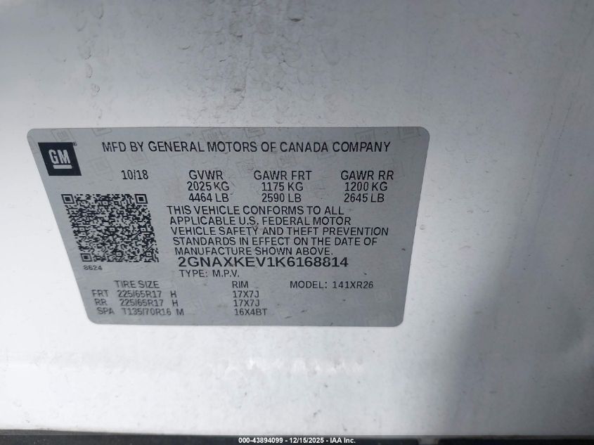 Колір БілийЦиліндри 4Привід Передній привідVIN 2GNAXKEV1K6168814Стан СтаціонарноУшкодження Передня або задня