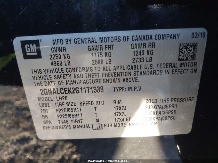 2016 CHEVROLET EQUINOX - 2GNALCEK2G1171538, колір - , 2.4, Бензин, Передній привід із США