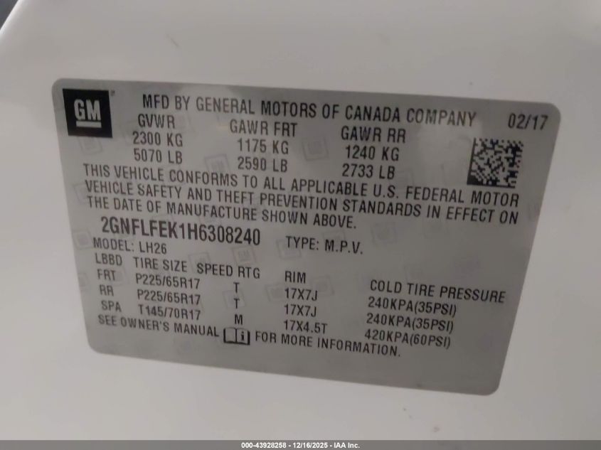 2017 CHEVROLET EQUINOX - 2GNFLFEK1H6308240, колір - Білий, 2.4, Бензин, Повний привід із США
