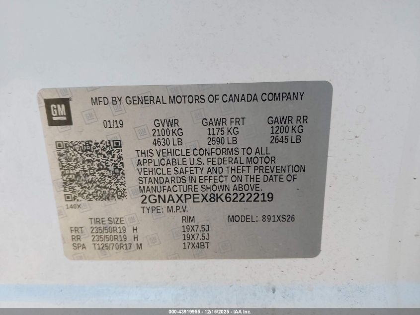 2019 CHEVROLET EQUINOX - 2GNAXPEX8K6222219, колір - Білий, 2.0, Бензин, Передній привід із США