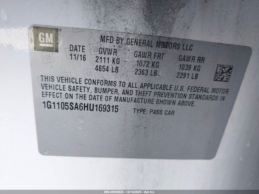 2017 CHEVROLET IMPALA - 1G1105SA6HU169315, колір - Білий, 2.5, Бензин, Передній привід із США