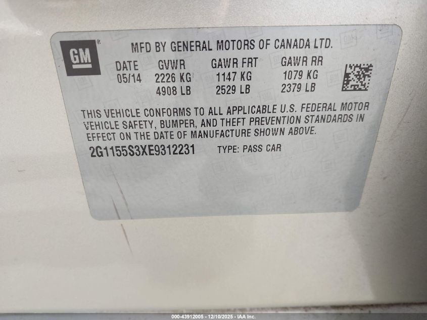 Колір ЗолотийЦиліндри 6Привід Передній привідVIN 2G1155S3XE9312231Стан СтаціонарноУшкодження Звичайний знос