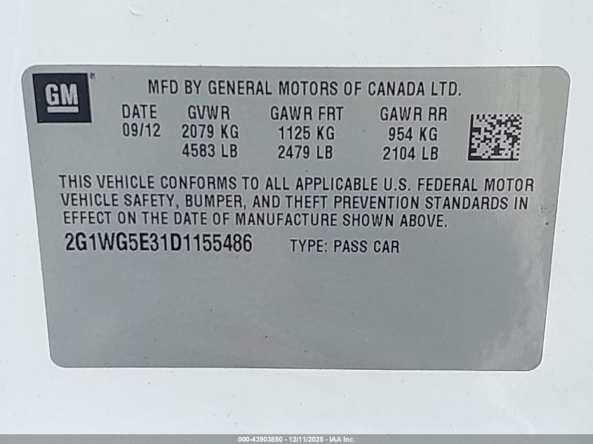 2013 CHEVROLET IMPALA - 2G1WG5E31D1155486, колір - Білий, 3.6, Бензин, Передній привід із США