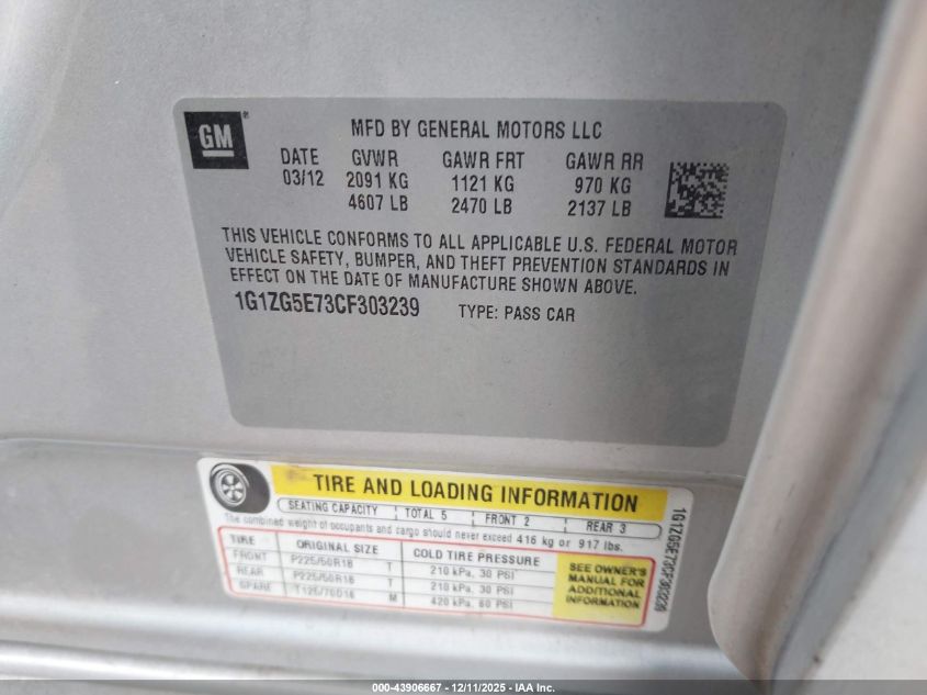 2012 CHEVROLET MALIBU - 1G1ZG5E73CF303239, колір - Срібний, 3.6, Бензин, Передній привід із США