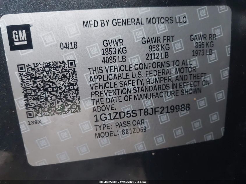 Колір СірийЦиліндри 4Привід Передній привідVIN 1G1ZD5ST8JF219988Стан НевідомоУшкодження Звичайний знос