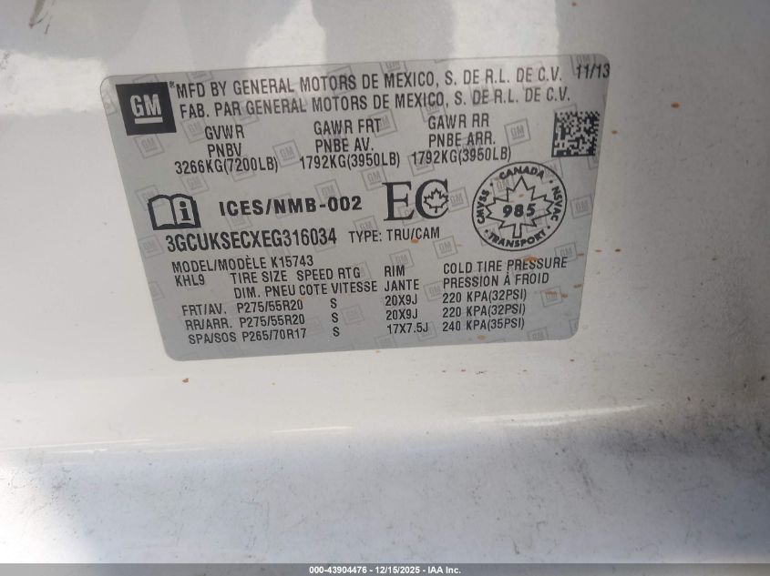 Колір БілийЦиліндри 8Привід Повний привідVIN 3GCUKSECXEG316034Стан СтаціонарноУшкодження З боків