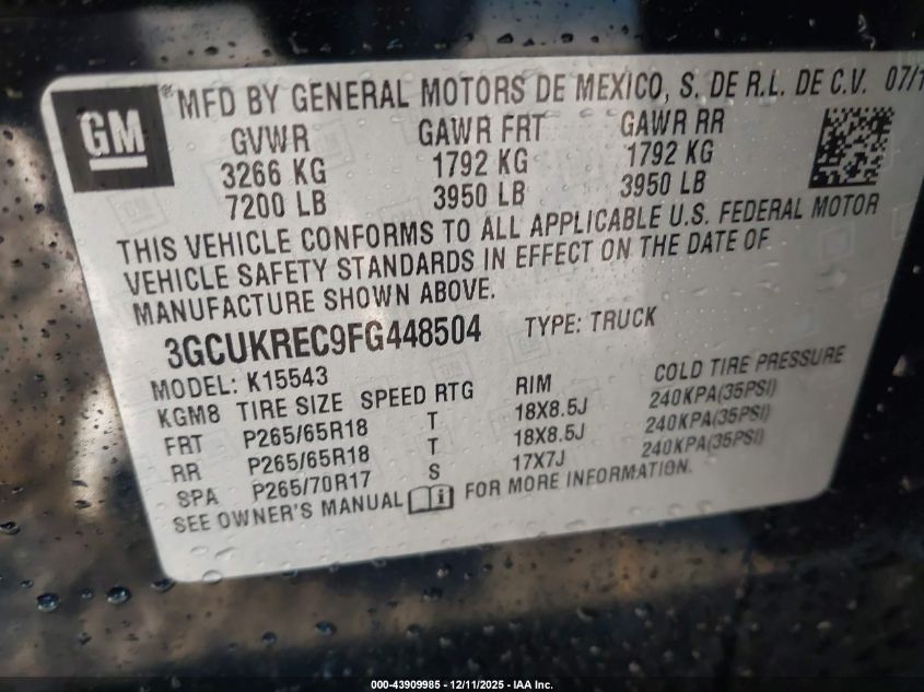 Колір ЧорнийЦиліндри 8Привід Повний привідVIN 3GCUKREC9FG448504Стан ЗаводитьсяУшкодження Права сторона