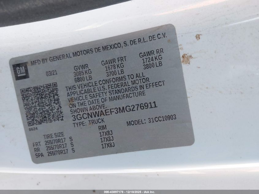 2021 CHEVROLET SILVERADO 1500 - 3GCNWAEF3MG276911, колір - Білий, 5.3, Бензин, із США