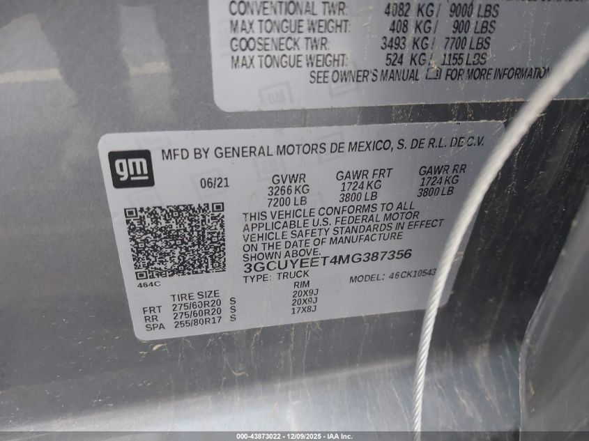 Колір СірийЦиліндри 6Привід Повний привідVIN 3GCUYEET4MG387356Стан СтаціонарноУшкодження ВандалізмДата аукціона 2025-12-18