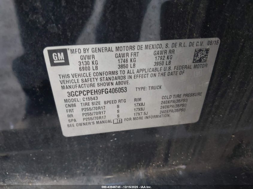 2015 CHEVROLET SILVERADO 1500 - 3GCPCPEH9FG406053, колір - Чорний, 4.3, Бензин, із США