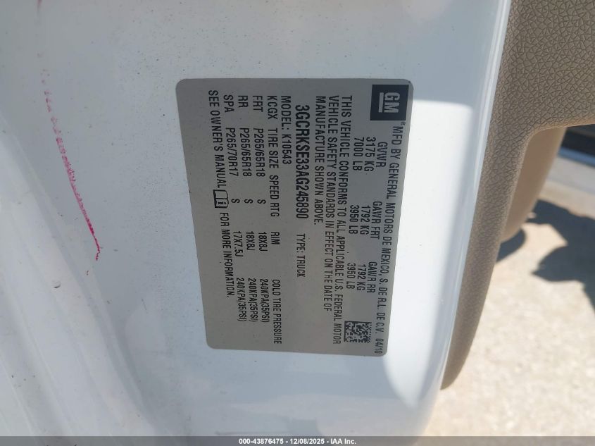 Колір БілийЦиліндри 8Привід Повний привідVIN 3GCRKSE33AG245890Стан СтаціонарноУшкодження Звичайний знос