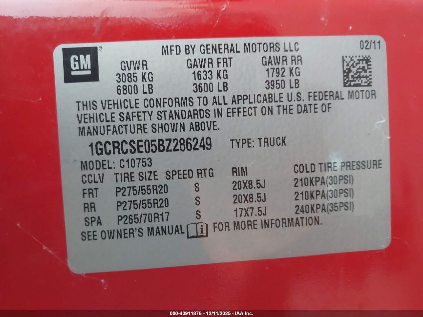 Колір ЧервонийЦиліндри 8VIN 1GCRCSE05BZ286249Стан СтаціонарноУшкодження Звичайний зносДата аукціона 2025-12-18