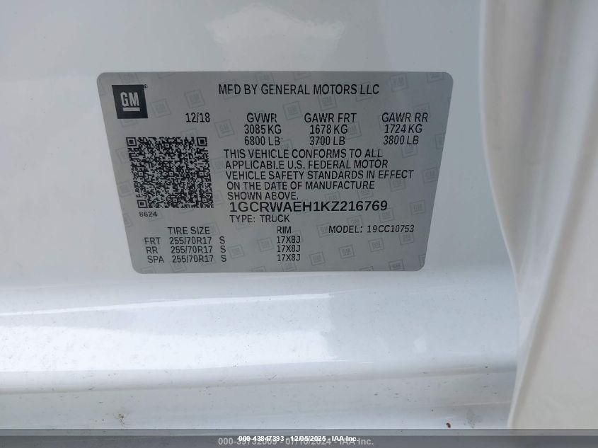 2019 CHEVROLET SILVERADO 1500 - 1GCRWAEH1KZ216769, колір - Білий, 4.3, Бензин, із США