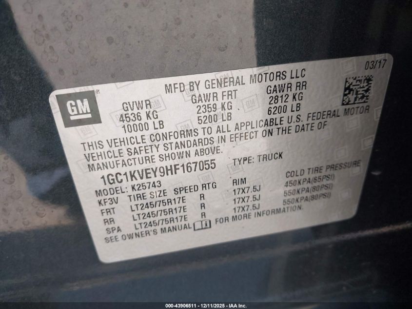 Колір СірийЦиліндри 8Привід Повний привідVIN 1GC1KVEY9HF167055Стан Заводиться та їде (перевірено)Ушкодження Права сторона