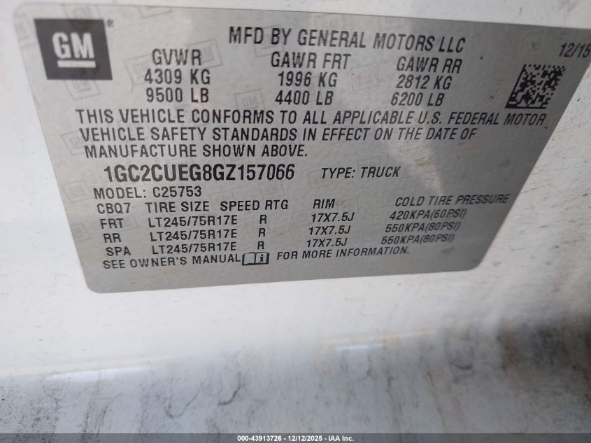 Колір БілийЦиліндри 8VIN 1GC2CUEG8GZ157066Стан СтаціонарноУшкодження Передня або задня
