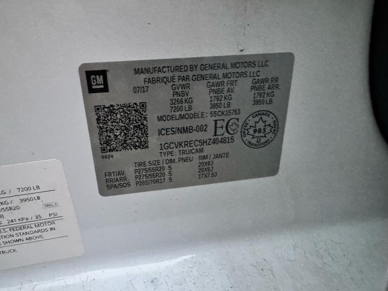 Колір БілийЦиліндри 8Привід 4x4 з заднім приводомVIN 1GCVKREC5HZ404815Стан Заводиться та їде (перевірено)Ушкодження НезначніДата аукціона 2025-10-08