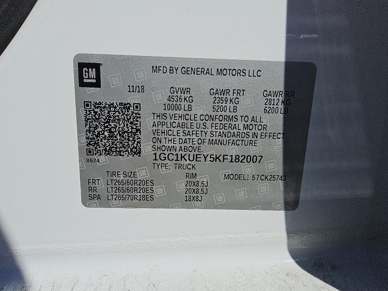 Колір БілийЦиліндри 8Привід 4x4 з заднім приводомVIN 1GC1KUEY5KF182007Стан НевідомоУшкодження НезначніДата аукціона 2025-10-09