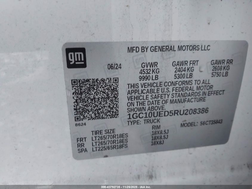 2024 CHEVROLET SILVERADO - 1GC10UED5RU208386, колір - Білий, 0.0, Електричний, Повний привід із США