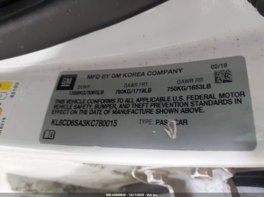 2019 CHEVROLET SPARK - KL8CD6SA3KC780015, колір - Білий, 1.4, Бензин, Передній привід із США