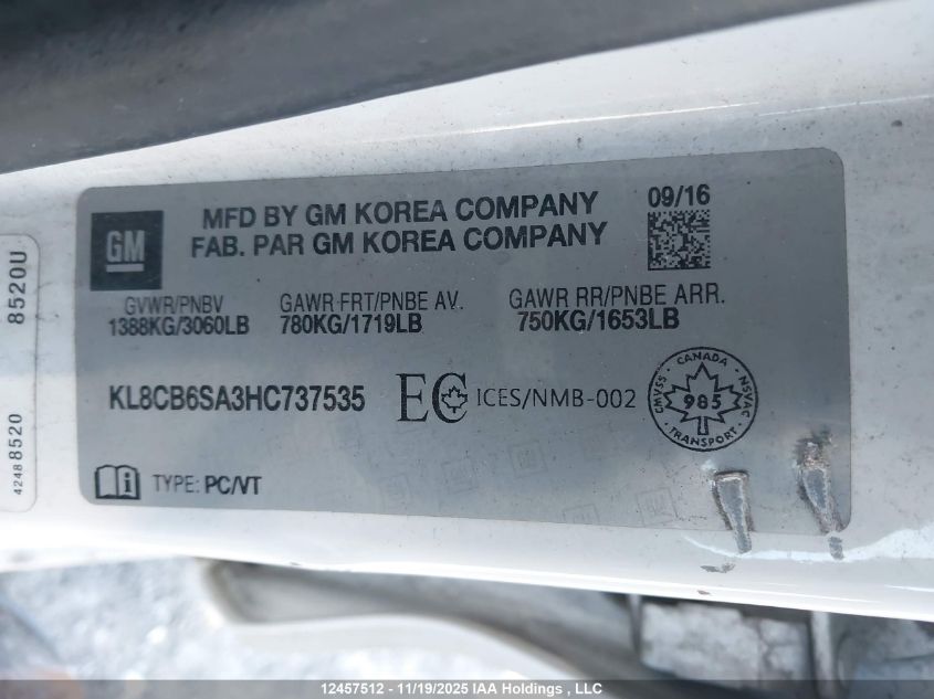 2017 CHEVROLET SPARK - KL8CB6SA3HC737535, колір - Білий, , Бензин, Невідомо із США