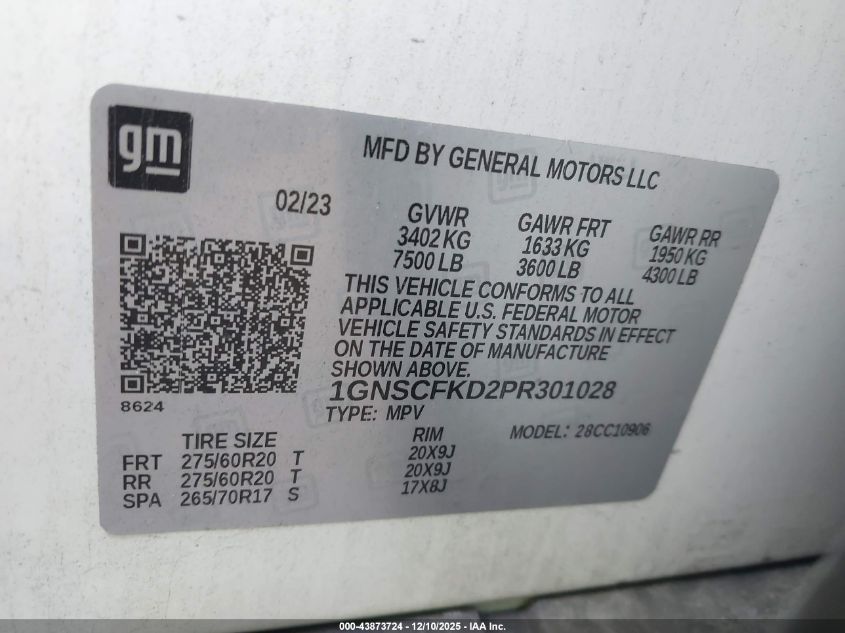 2023 CHEVROLET SUBURBAN - 1GNSCFKD2PR301028, колір - Білий, 5.3, Бензин, із США