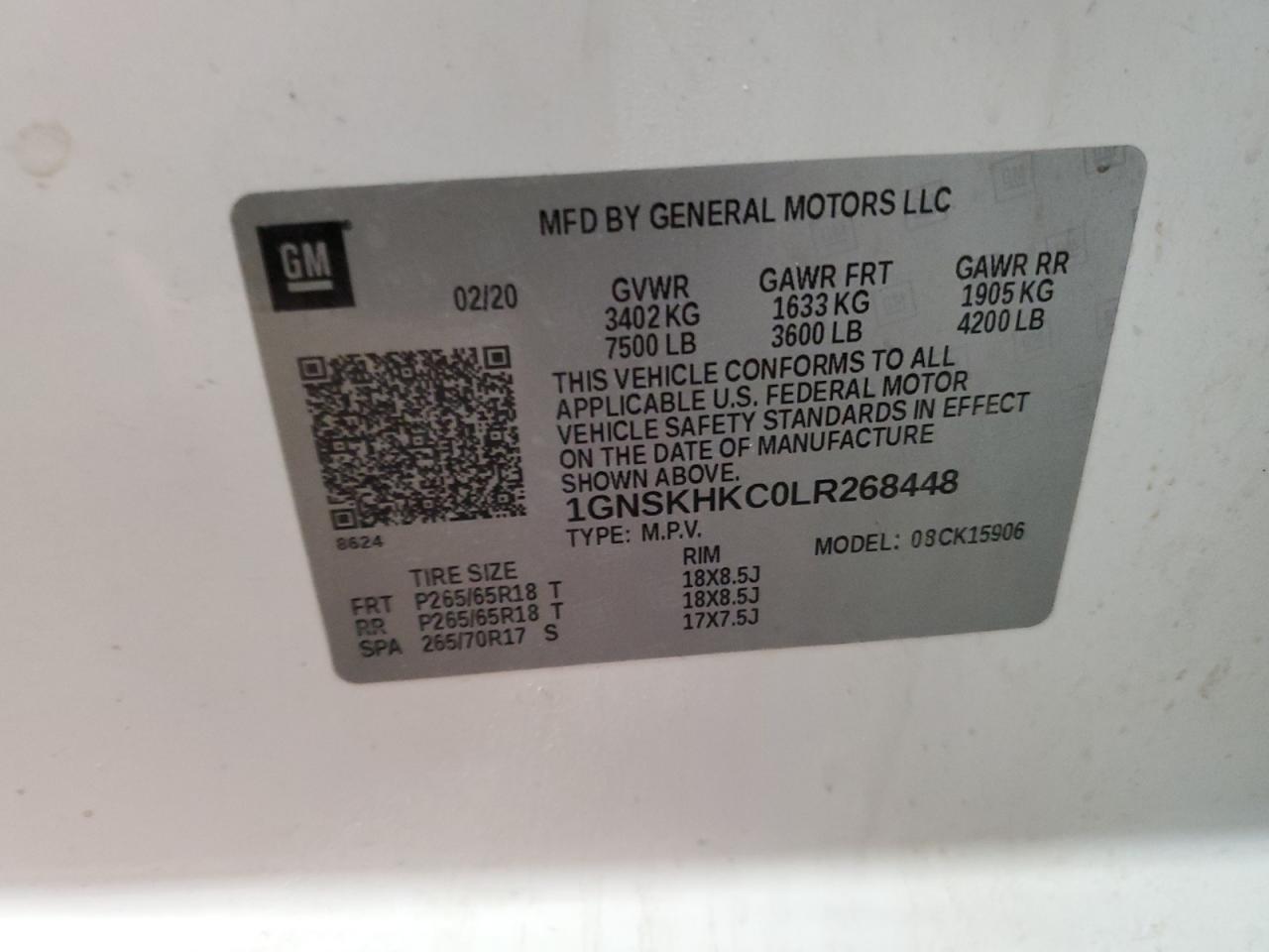 Колір БілийЦиліндри 8Привід 4x4 з заднім приводомVIN 1GNSKHKC0LR268448Стан Заводиться та їде (перевірено)Ушкодження Передня або задняДата аукціона 2025-10-08