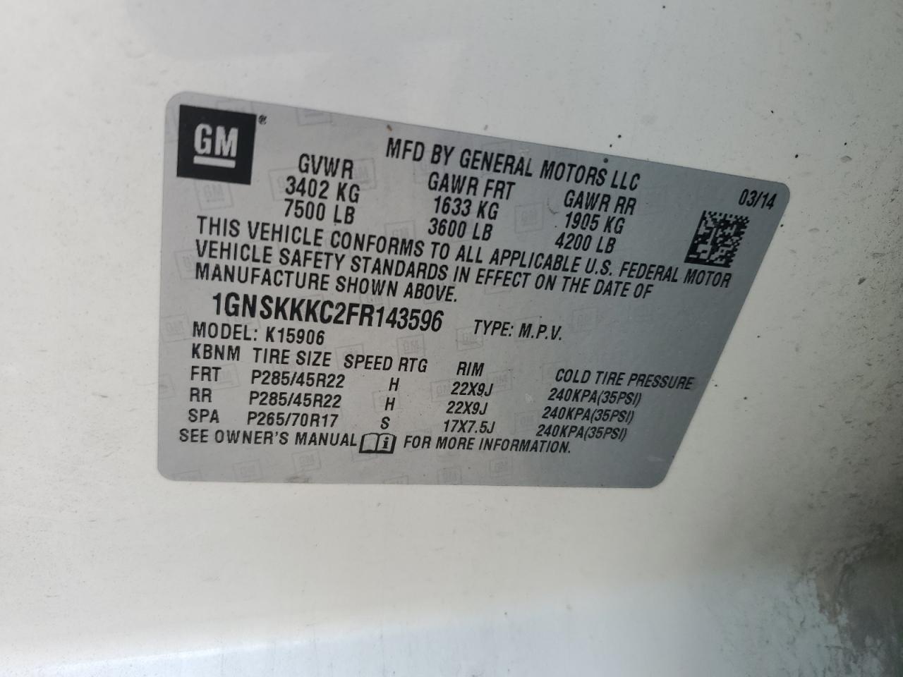 Колір БілийЦиліндри 8Привід 4x4 з заднім приводомVIN 1GNSKKKC2FR143596Стан Заводиться та їде (перевірено)Ушкодження Передня або задняДата аукціона 2025-10-10