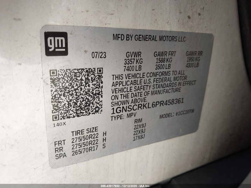 2023 CHEVROLET TAHOE - 1GNSCRKL6PR458361, колір - Білий, 6.2, Бензин, із США