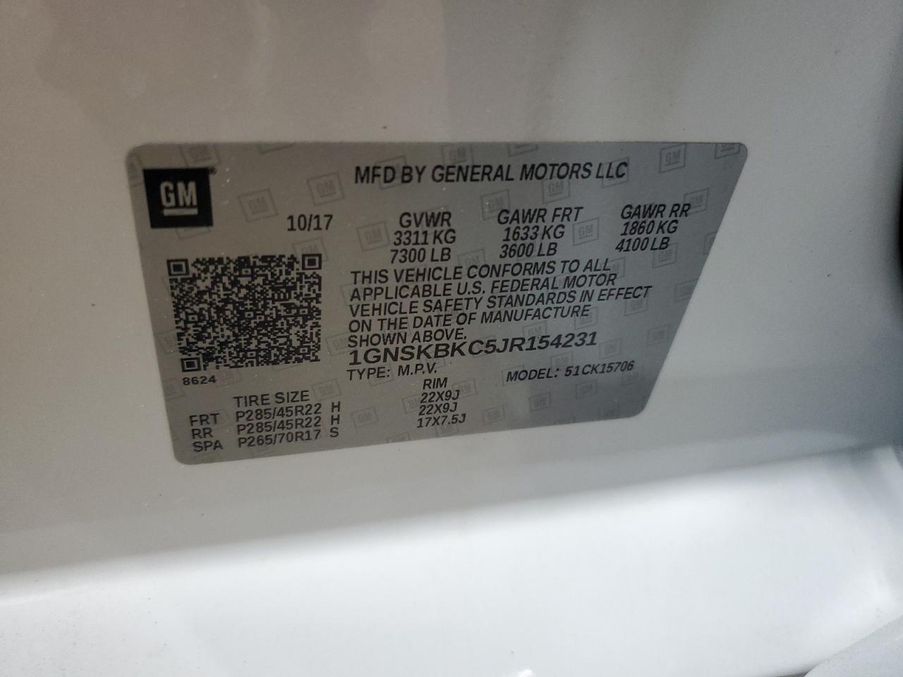 Колір БілийЦиліндри 8Привід 4x4 з заднім приводомVIN 1GNSKBKC5JR154231Стан НевідомоУшкодження По всьому авто