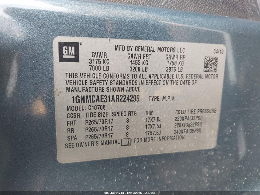2010 CHEVROLET TAHOE - 1GNMCAE31AR224299, колір - Бірюзовий, 5.3, Бензин, із США