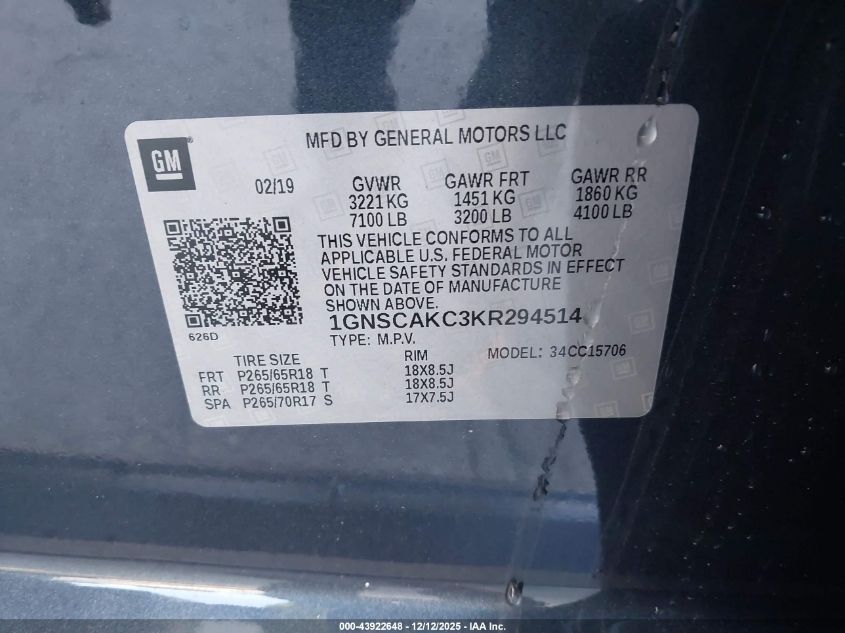 Колір СірийЦиліндри 8VIN 1GNSCAKC3KR294514Стан СтаціонарноУшкодження Механічні пошкодженняДата аукціона 2025-12-17
