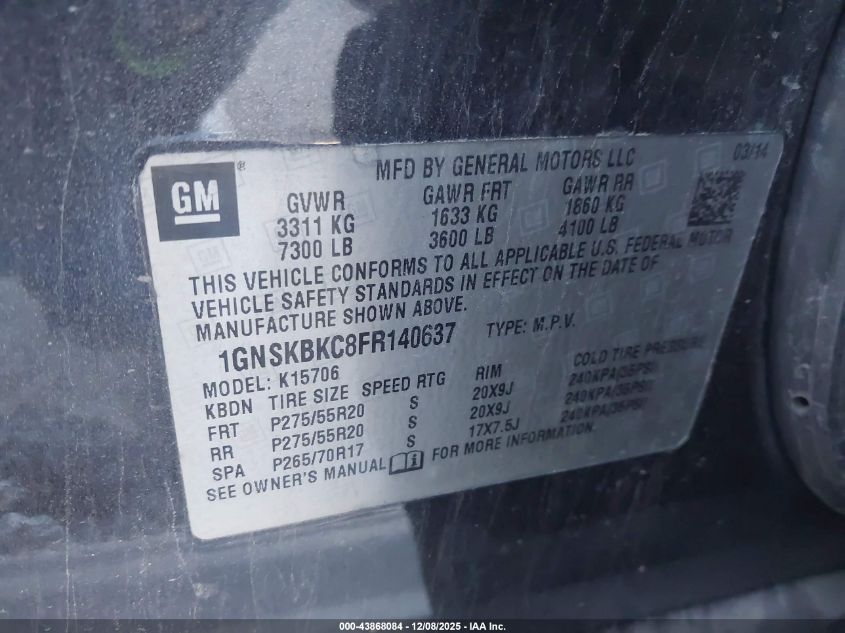 Колір ЧорнийЦиліндри 8Привід Повний привідVIN 1GNSKBKC8FR140637Стан СтаціонарноУшкодження Права сторона