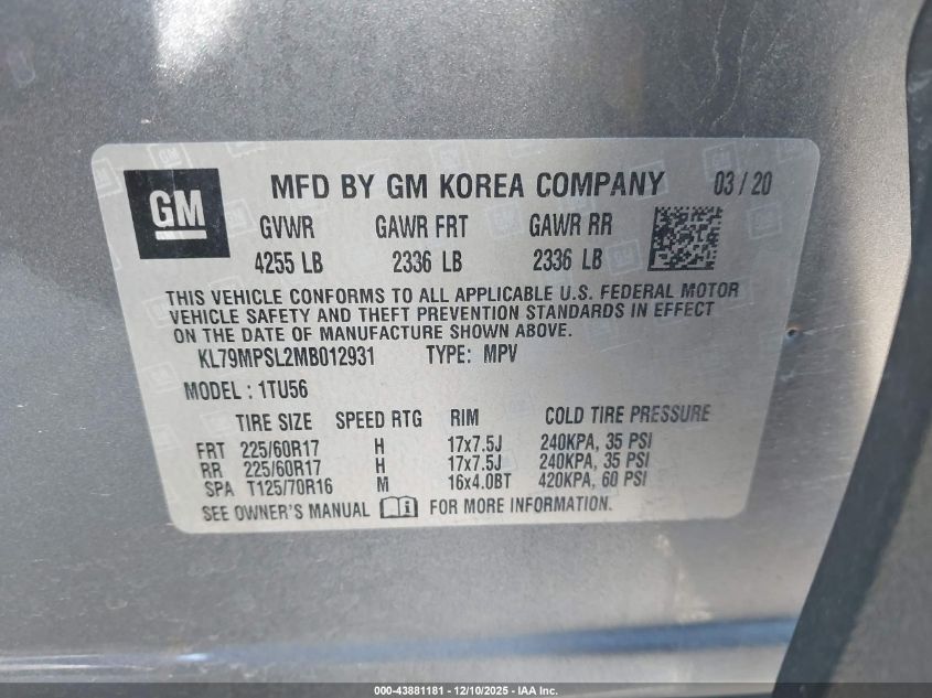 2021 CHEVROLET TRAILBLAZER - KL79MPSL2MB012931, колір - Сірий, 1.3, Бензин, Передній привід із США