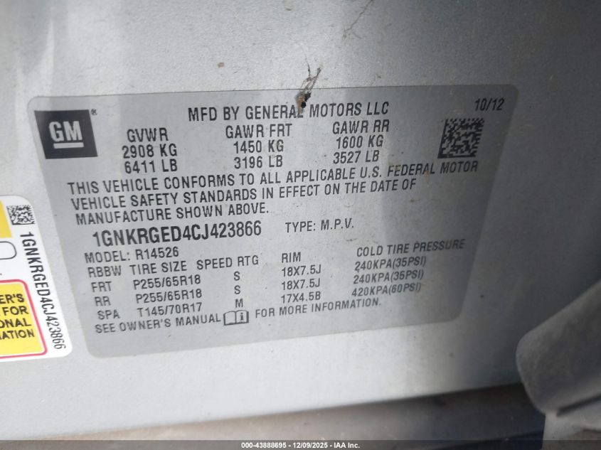 Колір СрібнийЦиліндри 6Привід Передній привідVIN 1GNKRGED4CJ423866Стан Заводиться та їде (перевірено)Ушкодження Звичайний зносДата аукціона 2025-12-22