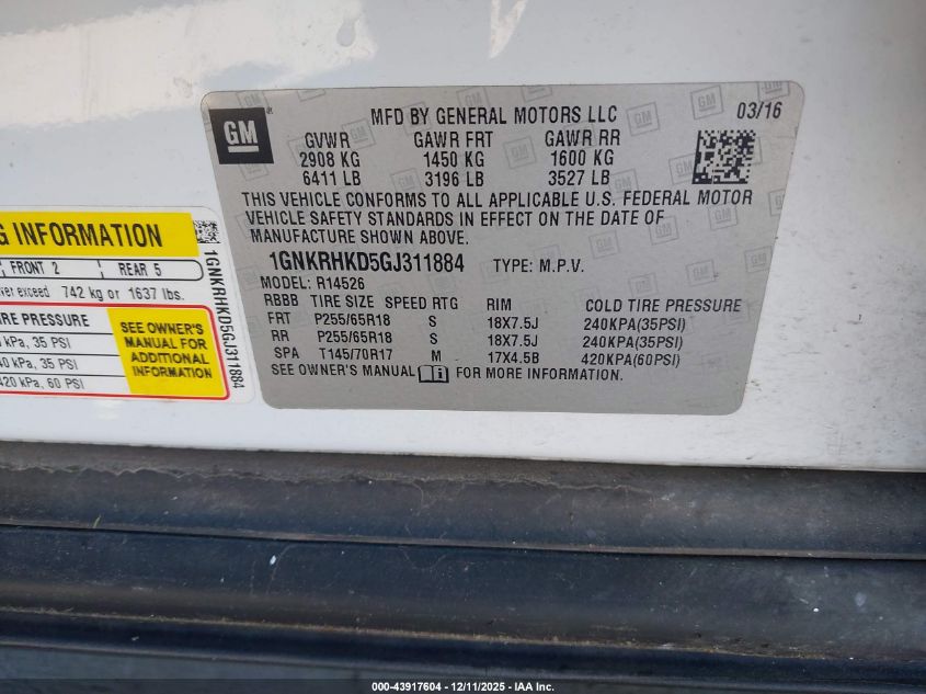 Колір БілийЦиліндри 6Привід Передній привідVIN 1GNKRHKD5GJ311884Стан СтаціонарноУшкодження Незначні