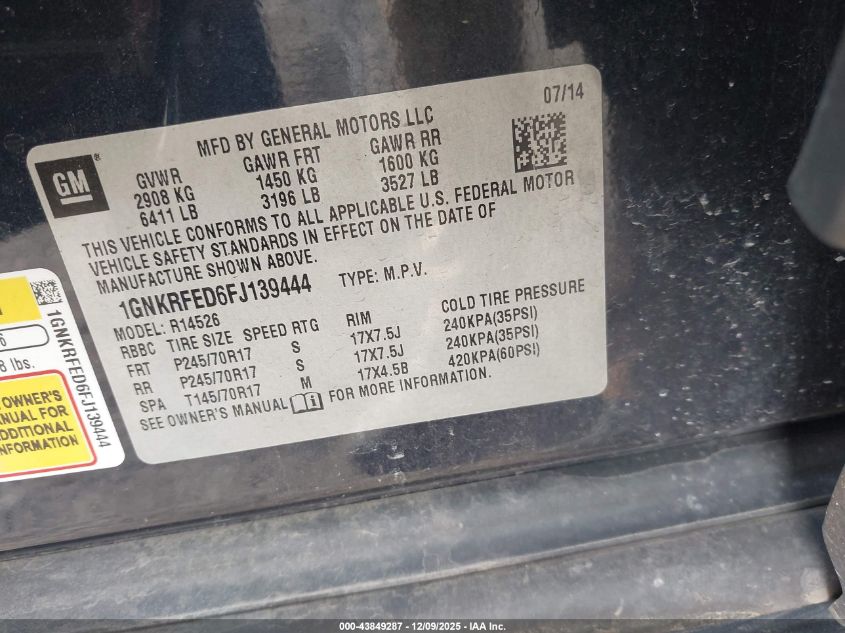 Колір СинійЦиліндри 6Привід Передній привідVIN 1GNKRFED6FJ139444Стан СтаціонарноУшкодження Біо/Хімічні