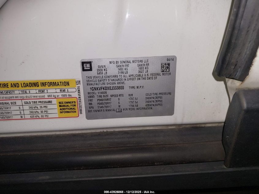 2014 CHEVROLET TRAVERSE - 1GNKVFKDXEJ333800, колір - Білий, 3.6, Бензин, Повний привід із США