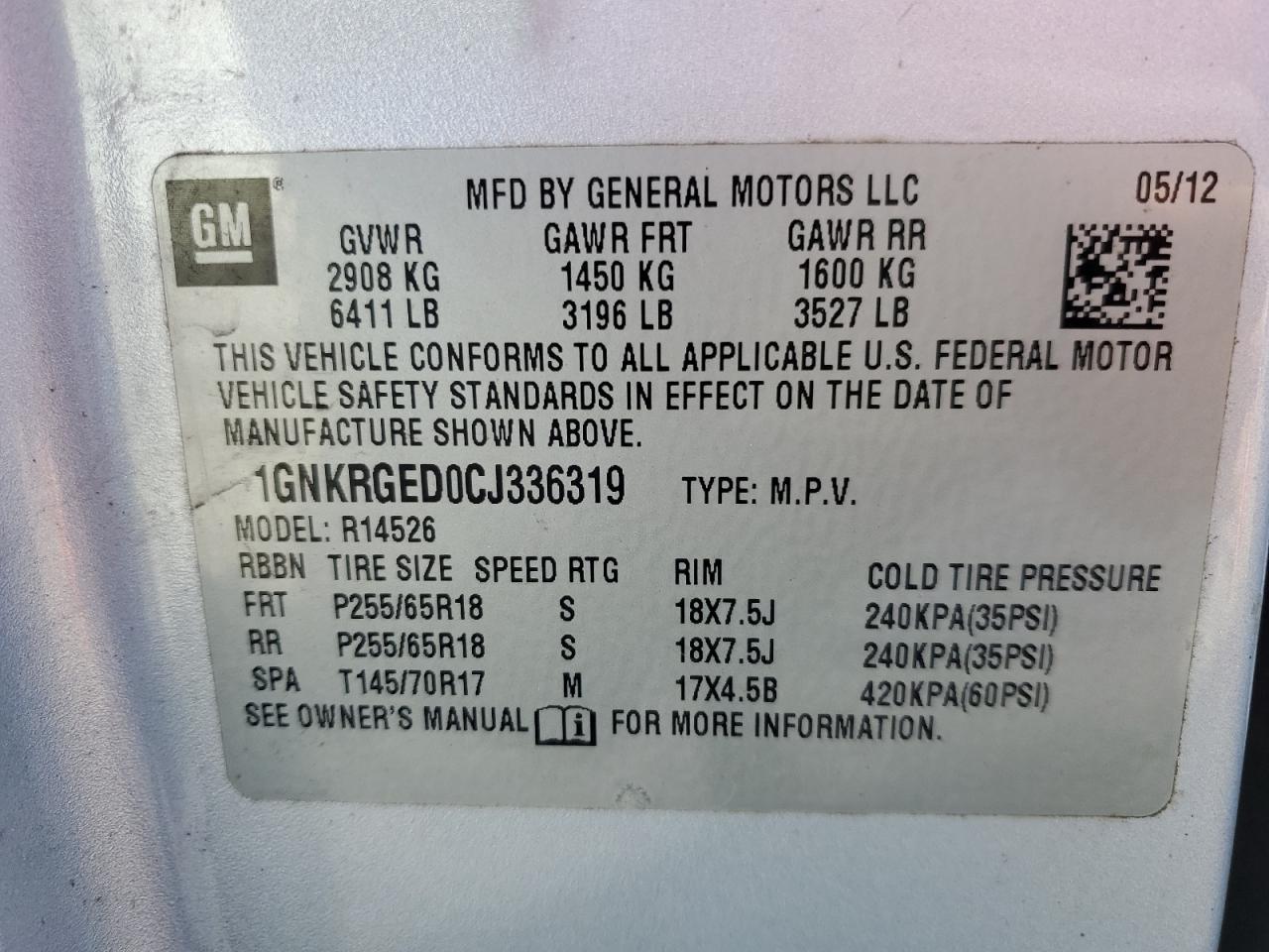 Колір СрібнийЦиліндри 6VIN 1GNKRGED0CJ336319Стан НевідомоУшкодження Передня або задня