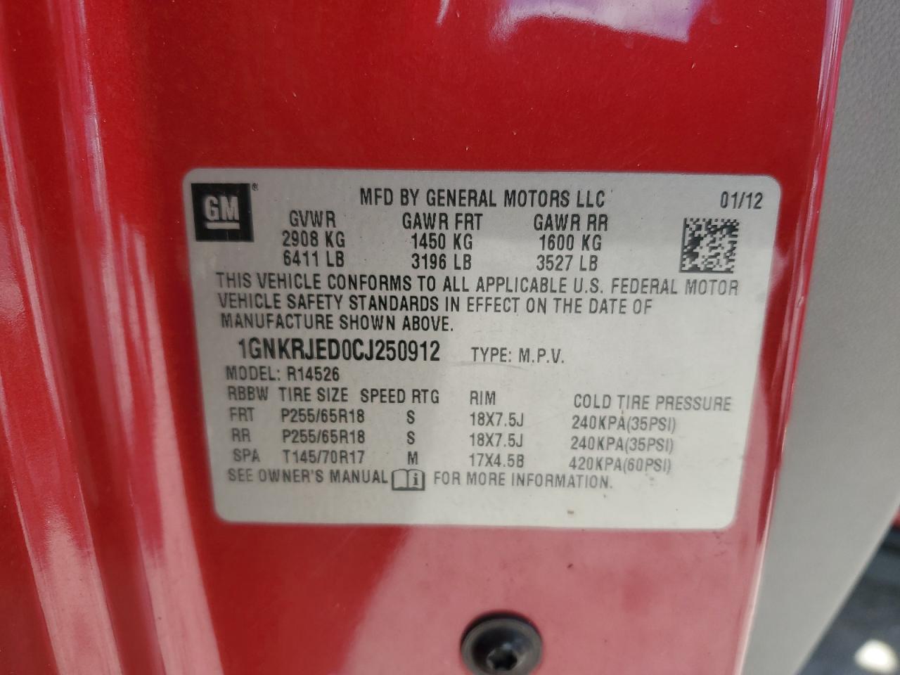 Колір ЧервонийЦиліндри 6VIN 1GNKRJED0CJ250912Стан НевідомоУшкодження НезначніДата аукціона 2025-10-08