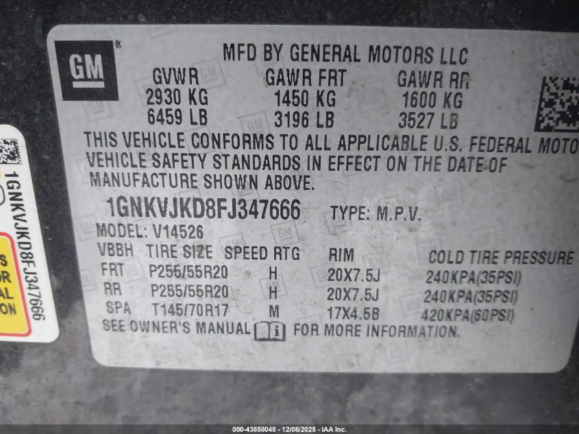 Колір СірийЦиліндри 6Привід Повний привідVIN 1GNKVJKD8FJ347666Стан Заводиться та їде (перевірено)Ушкодження Передня ліва