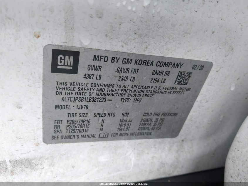 2020 CHEVROLET TRAX - KL7CJPSB1LB321293, колір - Білий, 1.4, Бензин, Повний привід із США