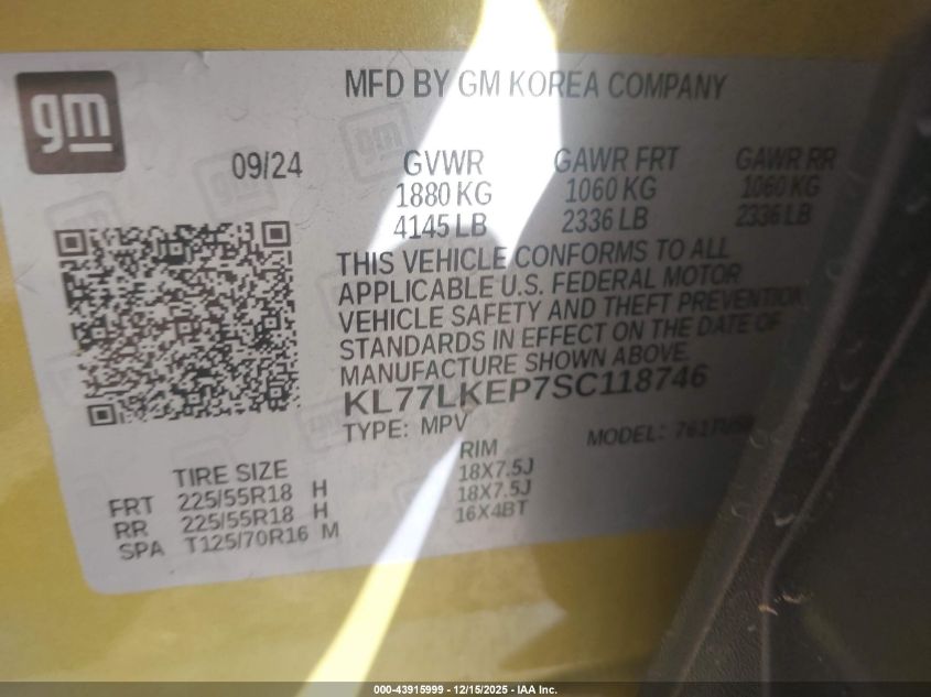 2025 CHEVROLET TRAX - KL77LKEP7SC118746, колір - Жовтий, 1.2, Бензин, Передній привід із США