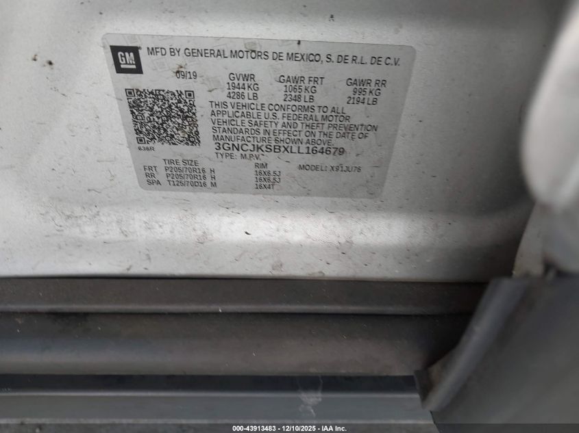 2020 CHEVROLET TRAX - 3GNCJKSBXLL164679, колір - Срібний, 1.4, Бензин, Передній привід із США