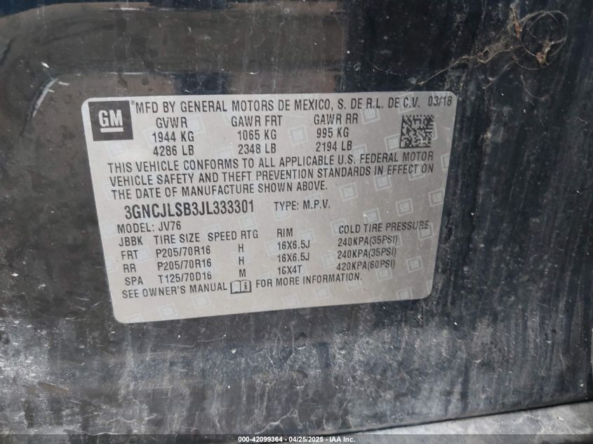2018 CHEVROLET TRAX - 3GNCJLSB3JL333301, колір - Чорний, 1.4, Бензин, Передній привід із США